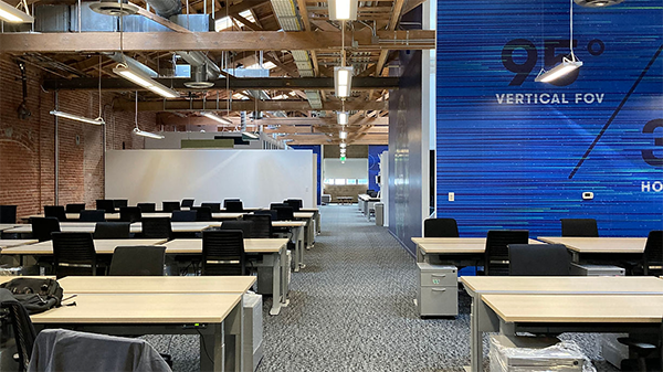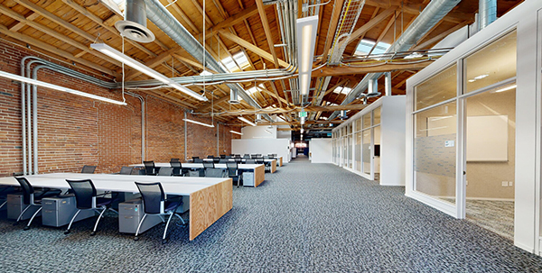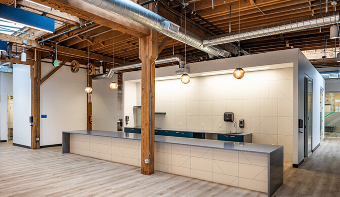 The project scope included a new reception and lobby, diverse workspaces including open office areas, conference and huddle rooms, a break room, storage, assembly spaces, and updated accessible restrooms.